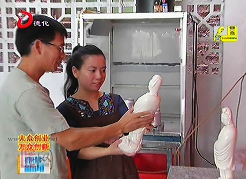 在庄少卿、黄明玉的陶瓷工作室,记者看到,一尊尊弘一法师塑像笑容微露,目视前方,宽腰阔袖,重磅下垂,端庄严整又自在无碍。作品的创作者庄少卿、黄明玉分别来自我县三班镇和湖南省湘西自治州。1993年,庄少卿到深圳创作树脂雕塑,在工作中结识了从湖南省常德工艺美术学校毕业的黄明玉,他们经常在一起交流、探讨,彼此互相吸引,还迸出了爱情的火花,组成了幸福的家庭。在深圳漂泊了十八年后,庄少卿积累了丰富的技术经验,他非常想念家乡德化,觉得还是家乡的陶瓷文化内涵比较深厚,便萌生了回乡创业的想法。2011年,夫妻俩返回了德化,成立了自己的陶瓷工作室。