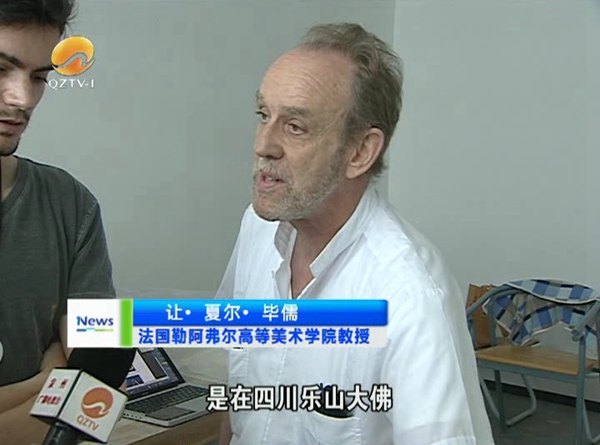 法国勒阿弗尔高等美术学院教授 让·夏尔·毕儒:你们大家看一下这个作品,这个轮廓是在四川乐山大佛,这个轮廓这样刮了一圈,有个艺术家带他去有荷花的地方,应该是个公园,利用荷叶的形状把它的叶子拿回来,把双手放在一起,有一个空把这东西放在手里,是想把手填满。