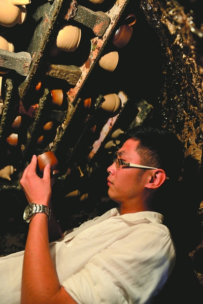 德化洞上陶艺村月记窑内,一名创业大学生在查看柴烧作品。