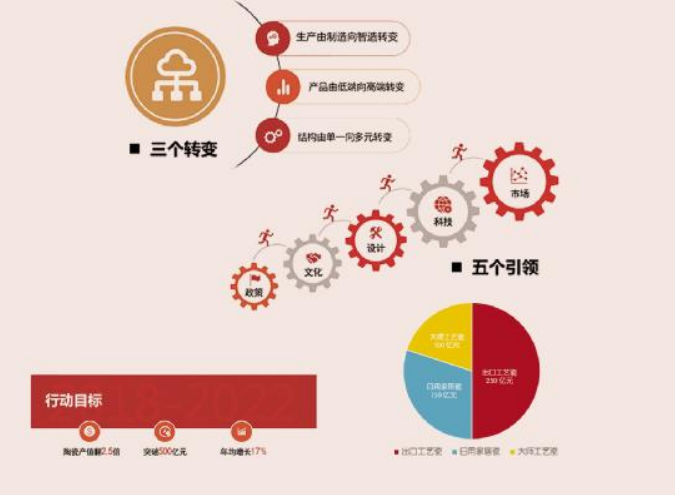 《五年行动计划》提出:未来五年,我县将坚持陶瓷产业主导地位,围绕生产由制造向智造转变、产品由低端向高端转变、结构由单一向多元转变“三个转变”,深入实施政策、文化、设计、科技、市场“五个引领”,增强出口工艺瓷的工业设计和文化创意元素,提升日用家居瓷的质量和品牌,推动大师工艺瓷的继承与创新,强化政府职能服务保障力度,促进德化陶瓷产值、品质、影响力摆脱瓶颈,力争到2022年陶瓷产业产值翻2.5倍,突破500亿元,年均增长17%左右。在500亿大盘中,出口工艺瓷产值要达到250亿元,日用家居瓷要达到150亿元,大师工艺瓷要达到100亿元。