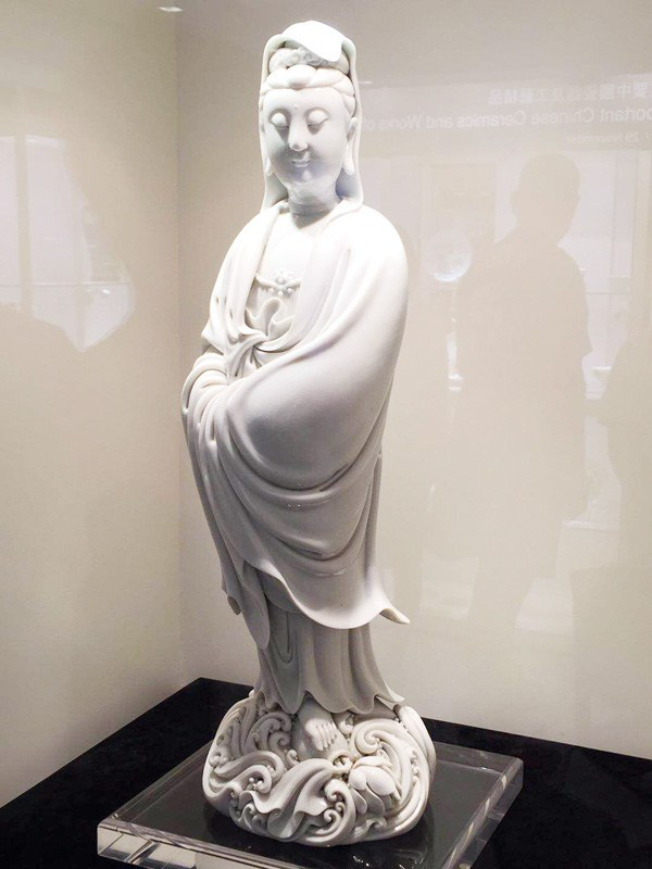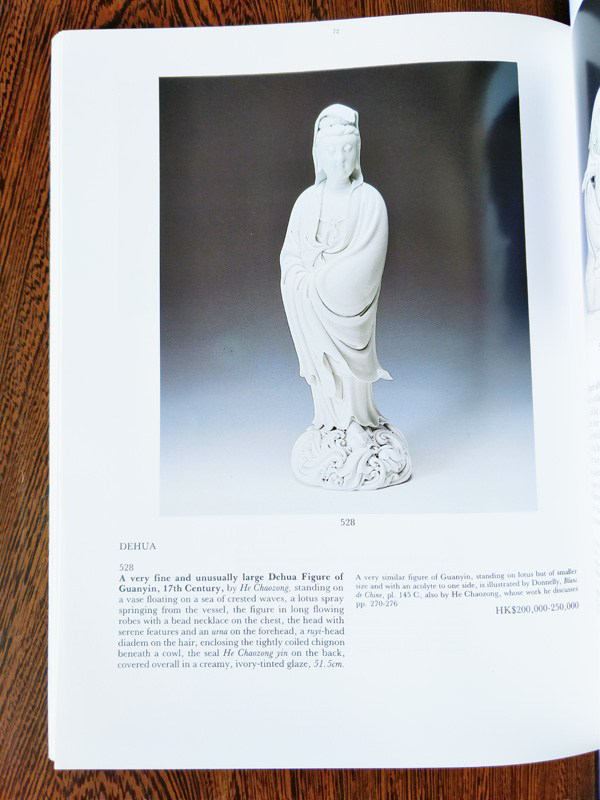 更为难得的是,故宫博物院、泉州海外交通史博物馆等均珍藏有何朝宗制的渡海观音多为46cm,而此尊高51.5cm,在明代德化瓷塑中更属难成之大器。此外,此尊渡海观音无论是胎釉的温润,瓷质的坚实,抑或是神态的刻划等方面,都堪称极品,此外,此尊渡海观音,品相保存,十分完整,亦属难得。