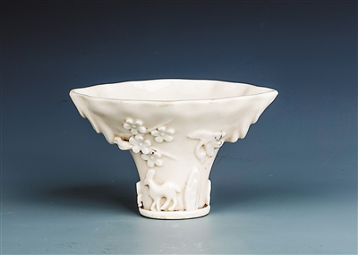 仿犀角杯是德化白瓷的常见器形,其造型源于饮酒所用的犀角杯。犀角杯在有明一代即是稀罕之物,曹昭《格古要论·珍奇论》中言:“犀角,出南蕃、西蕃,云南亦有。成株肥大、花儿好及正透者价高……凡器皿,需要雕琢功夫及样范好。”《明史·卷六十七·舆服三》中有“二品,六梁,革带,授环犀,余同一品”的记载,即明朝二品官员的官服腰带是由犀角制成,足见其材质珍贵。以白瓷仿犀角,既得犀角之形,相对廉价,又另呈一番瓷韵美感,不得不赞叹德化制瓷艺人的独具匠心。