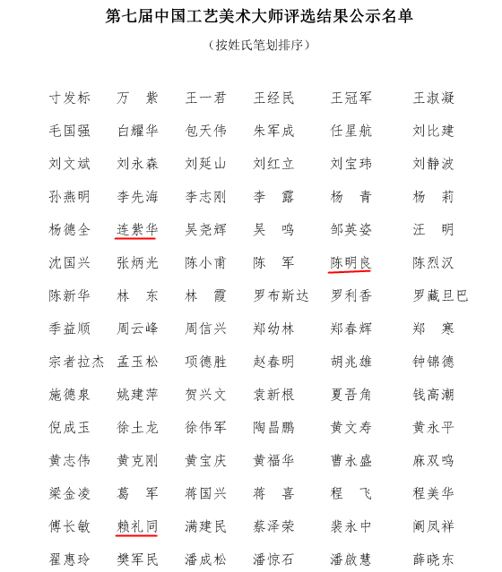 【德化网 讯】4月15日至20日,第七届中国工艺美术大师在上海进行评选。20日,中国轻工业联合会发布《关于对第七届中国工艺美术大师评选结果公示的通知》,对此次评选结果进行公示,来自我县的连紫华、陈明良、赖礼同三位工艺美术大师通过层层筛选最终获选。至此,我县共有6位陶瓷大师获评中国工艺美术大师殊荣。