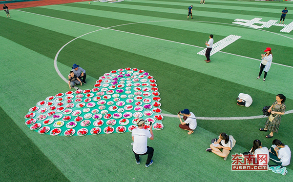 在徒步之旅起点泉州工艺美术职业学院操场上,520个瓷花盘和520把白瓷壶分别摆成“瓷❤”“一生”四字,2018件陶瓷摆放成“顺顺美美”四字,1314名徒步爱好者环绕着这八个字站立,彼此祝福。他们英姿勃勃、热情洋溢,伴随着团队旗帜从泉州工艺美院有序出发,齐征漫漫旅途。