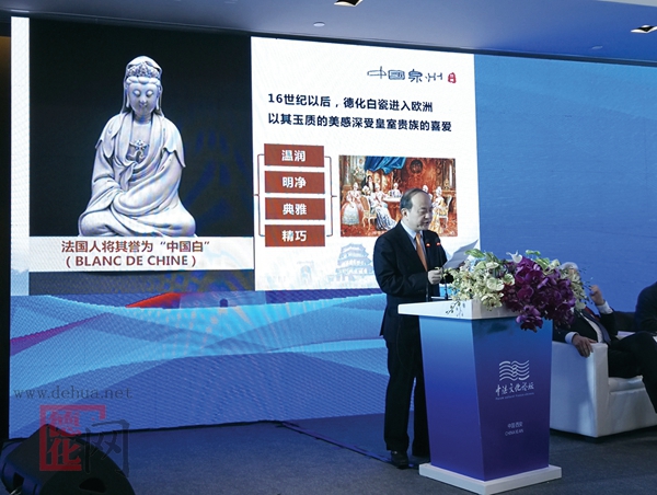 伴着精彩的PPT演示,泉州市副市长洪自强娓娓而谈。“千年前,一条以刺桐港等为起点的海上丝绸之路谱写了一段东西方文明交流对话与友好往来的伟大历史。”“泉州人像爱惜生命一样保护‘海上丝绸之路’文化遗产。” 洪自强着重介绍了德化陶瓷的制作历史、玉质美感、非遗保护情况等,还特别提出是法国人将BLANC DE CHINE“中国白”这个美誉赋予了德化陶瓷。