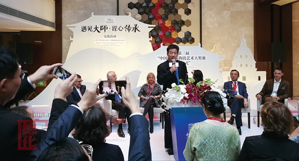 “遇见大师·匠心传承”交流活动中,蕴玉瓷庄苏献忠受邀携作品《石上鱼》《纸》与来自法国、陕西、苏州等地的19位工艺美术大师同堂展出。每件传统工艺品背后蕴藏的丝路故事,引发中外嘉宾浓厚兴趣,纷纷驻足观赏。