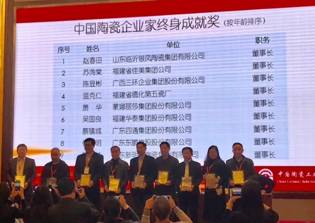 “中国陶瓷企业家终身成就奖”获得者(按年龄排序):苏尧棠 福建省佳美集团公司董事长,温克仁 福建省德化第五瓷厂董事长,吴国良 福建华泰集团股份有限公司董事长。