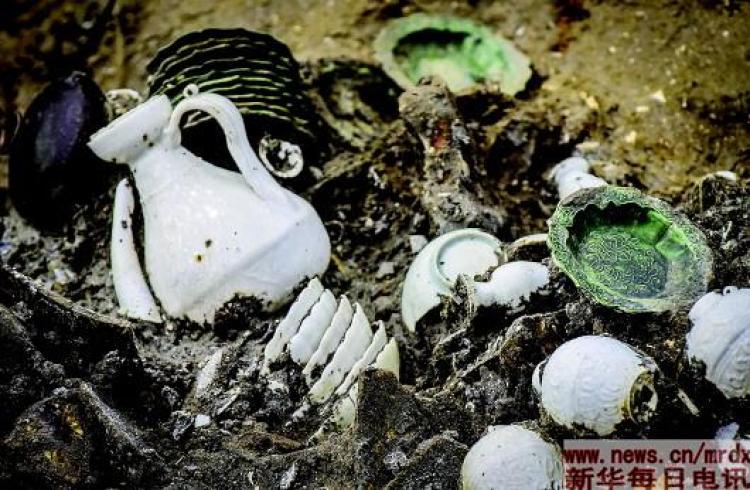 ▲“南海一号”右侧中部船舱位置散落着一摞摞福建德化窑白瓷器和福建磁灶窑绿釉器。(新华社记者刘大伟 摄)