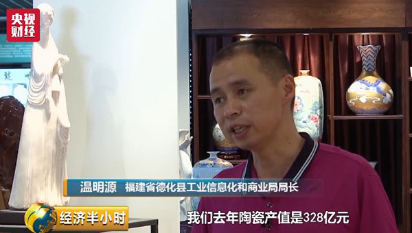 福建省德化县工业信息化和商务局局长温明源:去年我们整个陶瓷产值是328亿元,今年我们争取突破350亿元。