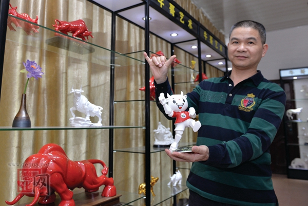 陶瓷雕塑艺术师郑建忠在赶制“牛瓷”雕塑