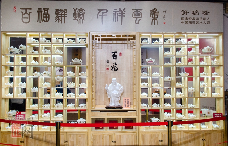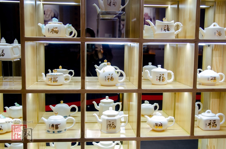 “百福”作品由一尊50厘米高的“百福弥勒”瓷塑和100把形态各异的德化羊脂玉瓷茶壶组成,为国内首套福文化白瓷茶壶作品。德化羊脂玉瓷茶壶将陶瓷文化、福文化与书法文化紧密结合,每一把壶身上都有百位历代名人名家书写的“福”字原稿,包含帝王将相、高僧大德、文学大咖、书画名家等,具有很高的观赏价值和收藏价值。