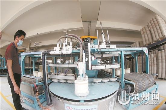 三五秒,一块泥土就滚压成型,10分钟左右,一条自动滚压生产线就完成一个流程……走进德化同鑫陶瓷有限公司的自动化生产车间,几条自动化生产线在三四名工人的操作下不停歇地运转。