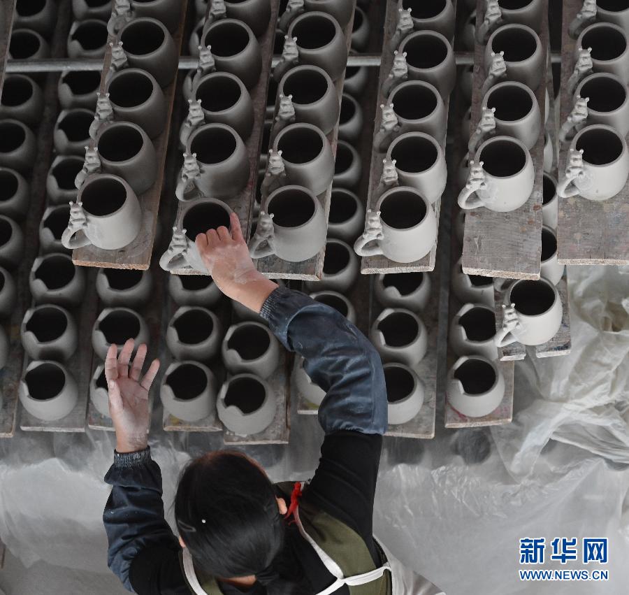 在福建省泉州市德化县顺美陶瓷厂,工人摆放马克杯以便烘干。