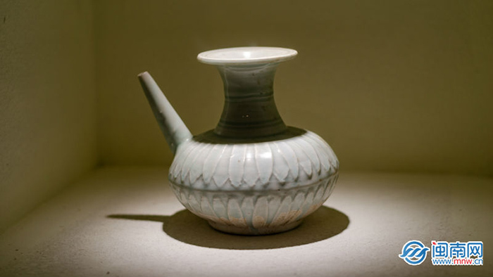 德化陶瓷发展,在宋元时期是第一个黄金期,不仅窑业水平高、规模大,产品也日益精湛,多为外销。当时,德化窑业依靠泉州海商瓷帮提供的海外市场需求信息,不断创新制造出德化窑产品;另一方面,他们还以市场导向,按订单烧制,展馆中的军持,就是东南亚穆斯林的订烧器皿。作为外销陶瓷生产基地,德化陶瓷蜚声海内外。
