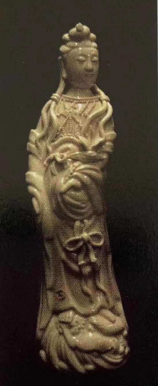 在同一个展览中的一个高大的观音立像也有何朝宗的标记(图22)。这是另一件具有纪念意义的作品,观音超过20英寸高,穿着白袍和披着斗篷站在海边的岩石上。一只脚露了出来,但是双手却藏了起来,紧扣在被微风轻轻吹动的长袍的长袖里。在某些方面,这个瓷塑在雕刻上甚至比文昌的模型更加令人印象深刻,而且在处理上也肯定更加复杂——比如头发和头饰,或者精致的波浪。