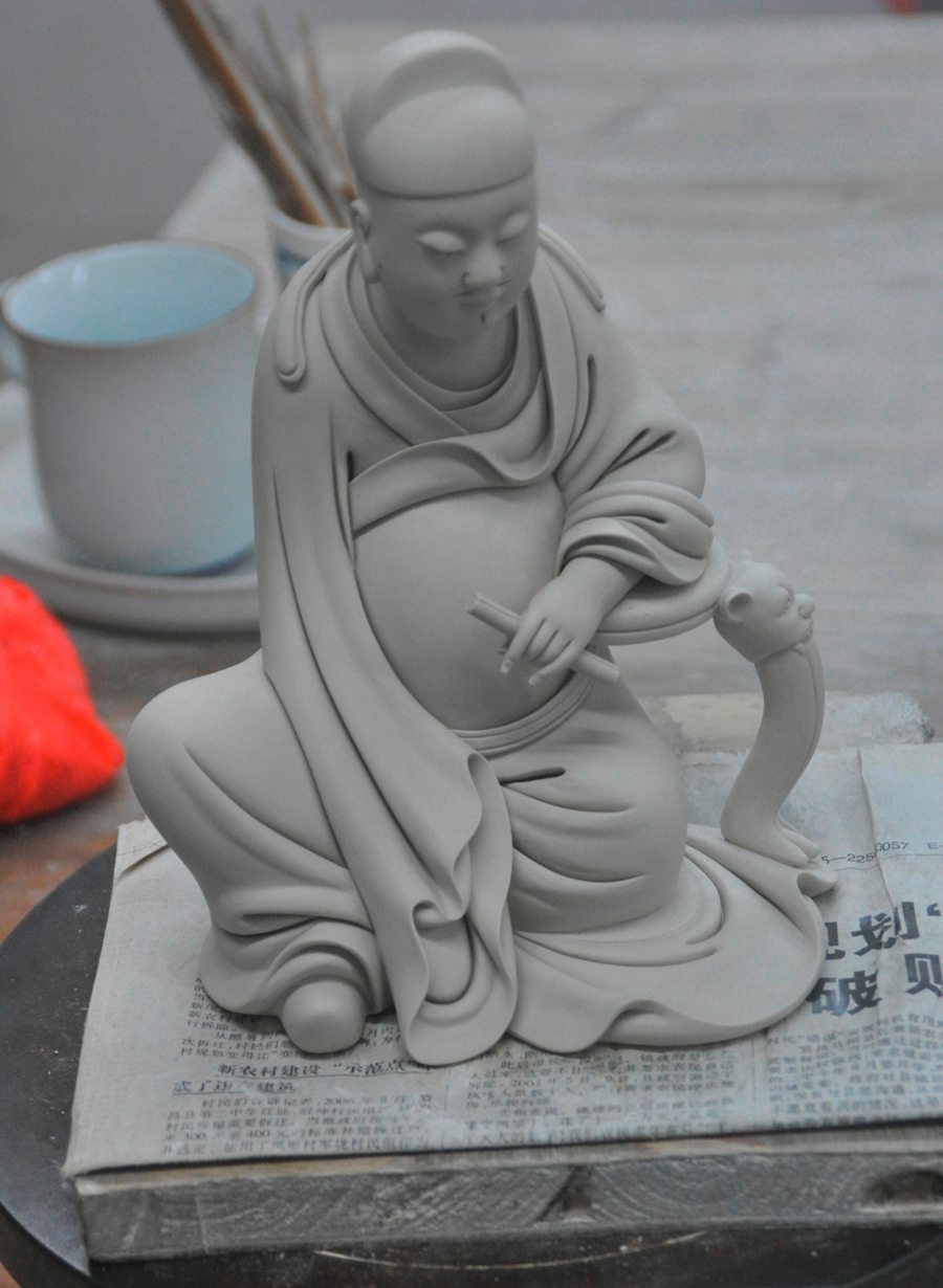 德化瓷烧制技艺可分为瓷土加工、雕塑成型、烧成三个过程。德化瓷烧制技艺国家级传承人陈明良介绍,陶瓷雕塑综合石刻、木雕、泥塑的技法特点,采用“捏、塑、雕、刻、刮、削、接、贴”八字技法,雕塑成型,然后放入窑中在一千多度的高温下烧制而成。其中,成型技艺有两种,一种是选用优质的高岭土直接塑造成型,一种是将泥塑翻制模具后再注浆或拓印成型,干后根据需要决定是否上釉。雕塑成型工艺,以模制为主,兼有少量捏制。