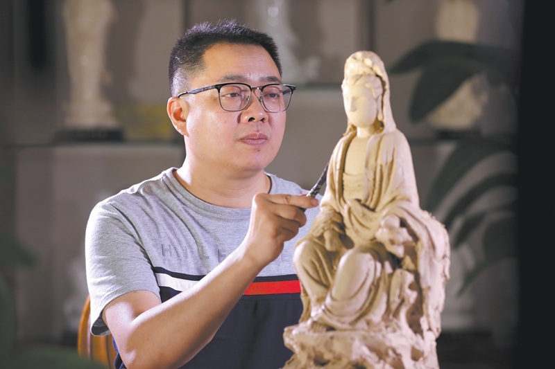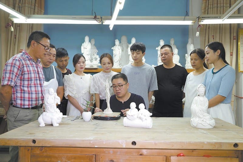 以飞天、祥云为主体,配有万里长城、神舟飞船等中华符号,将“飞天”这一“陆上丝绸之路”的文化元素,通过“德化瓷塑技艺”这一“海上丝绸之路”的文化载体进行表达,将中华民族的文化记忆与传统技艺完美融合……此次大赛,我县的福建省工艺美术大师、福建省陶瓷艺术大师、国家级非物质文化遗产项目——《德化瓷烧制技艺》福建省代表性传承人郑雄彭现场创作的《筑梦》,在众多参赛选手中脱颖而出,获得陶瓷雕塑工(职业工种)比赛的第一名,荣获“全国技术能手”称号。