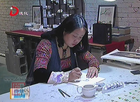 在林晓芳创办的“肃雅堂艺术瓷”工作室,山水花鸟,处处可见画笔在白瓷上留下的痕迹,瓷瓶上、瓷板上、挂盘上以及小小的茶杯上,因为林晓芳手中的画笔而瞬间富有生机。而在洁白的陶瓷上作画,一笔一划勾勒心中所想,也让林晓芳的生活丰富充实。这个出生在陶瓷彩绘世家的女子,因为从小耳濡目染慢慢喜欢上陶瓷作画,渐渐离不开这门艺术。