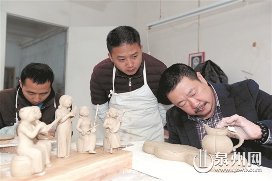近年来,德化县大力实施“人才兴瓷”战略,创建大师工作室,成立大师创作团队,通过“名师带徒”形式,推动陶瓷技艺的师承,培养更多的陶瓷工艺美术青年人才。新春伊始,德化县聚玉堂大师工作室早早开工,学徒们陆续前来学习陶瓷技艺。图为学徒在福建省工艺美术大师林建胜的指导下,创作富有闽南文化特色的艺术品。